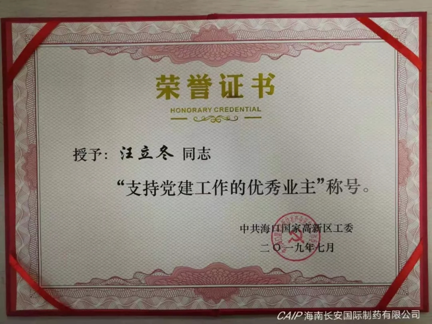 為表彰先進,弘揚正氣,中共海口國家高新區(qū)工委分別授予海南長安國際制藥有限公司黨支部書記汪立冬和黨支部委員陳麗娟“支持黨建工作的優(yōu)秀業(yè)主”和“優(yōu)秀黨務(wù)工作者”稱號。